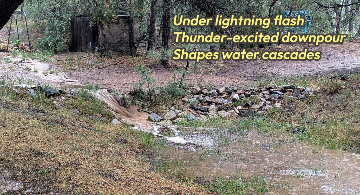 Under lightning flash  Thunder-excited downpour  Shapes water cascades