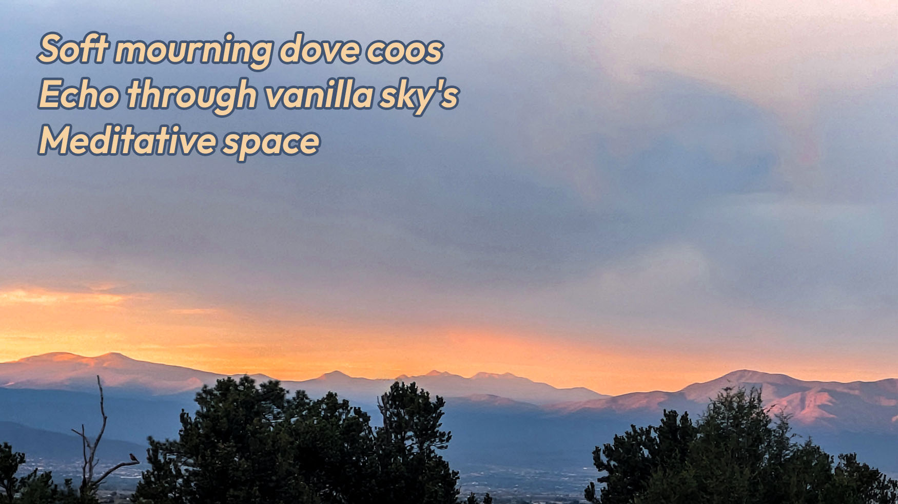 Soft mourning dove coosEcho through vanilla sky’sMeditative space