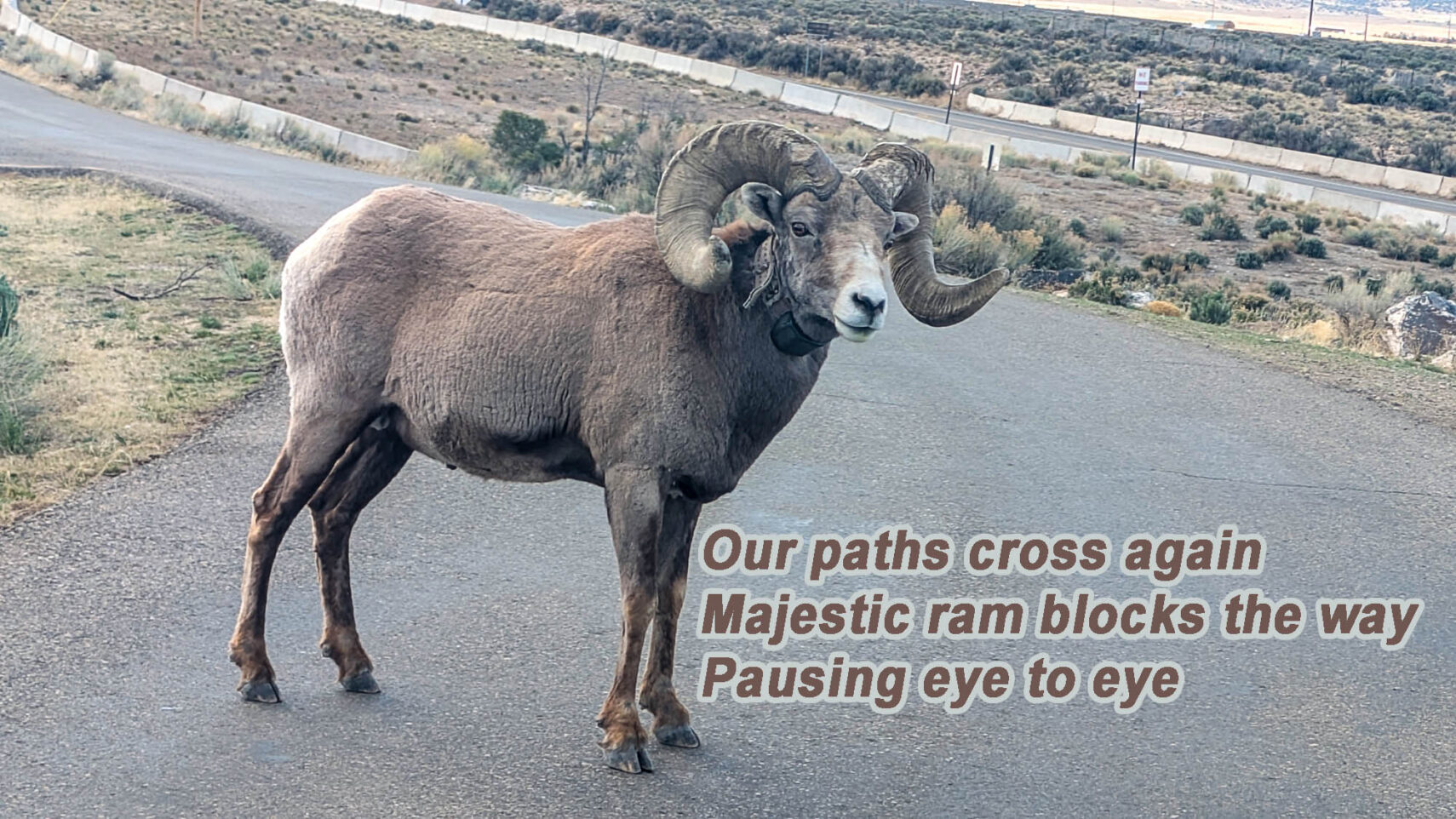 Our paths cross again Majestic ram blocks the way Pausing eye to eye