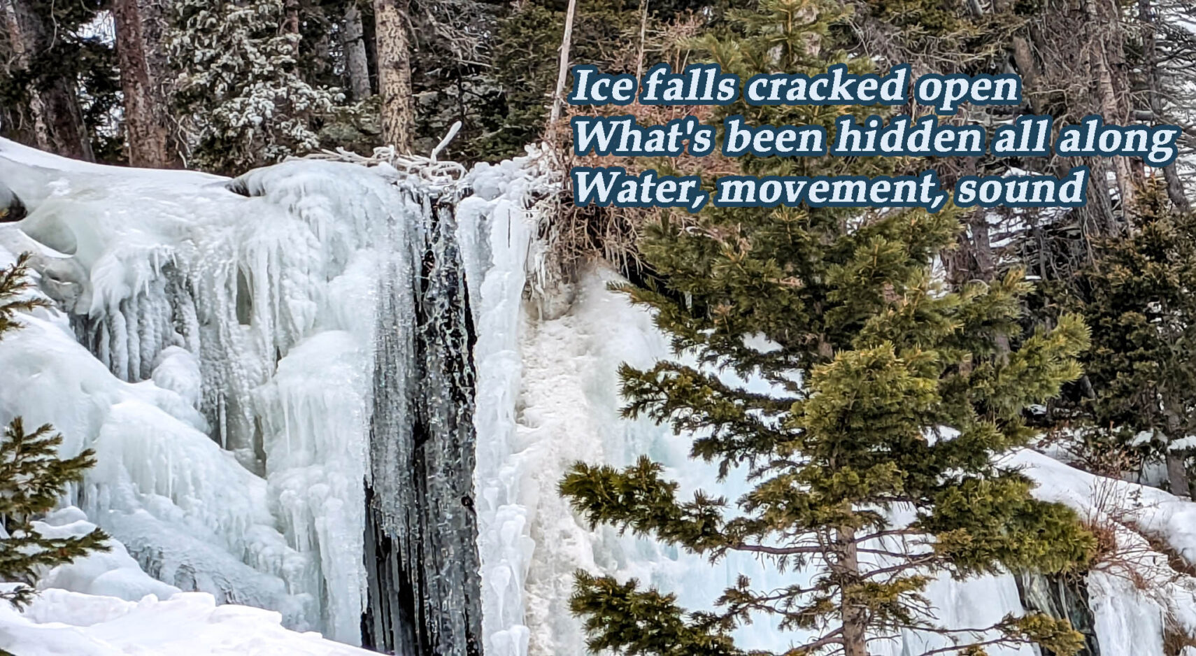 Ice falls cracked open What’s been hidden all along Water, movement, sound