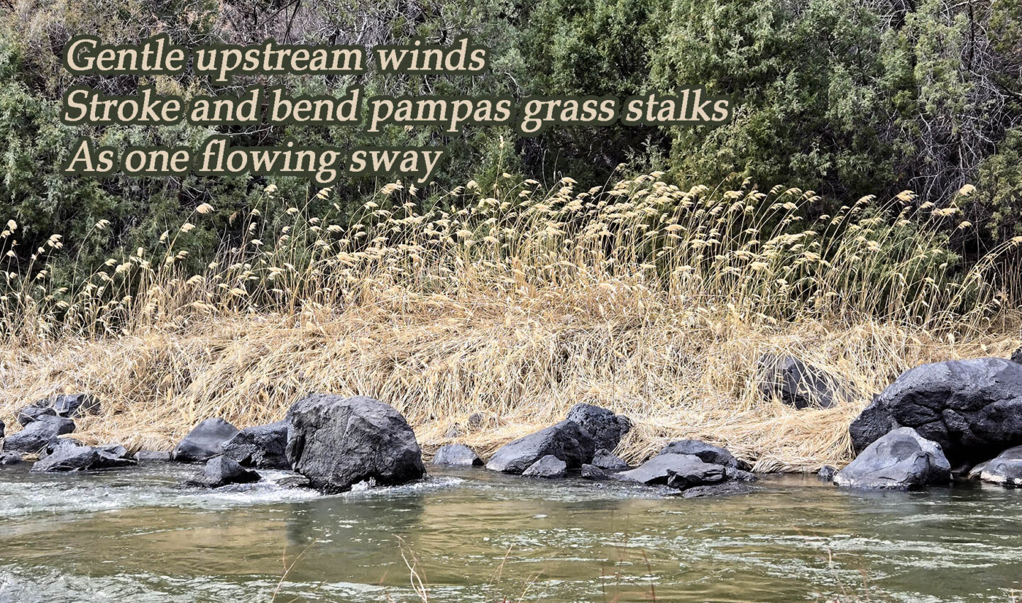 Gentle upstream winds Stroke and bend pampas grass stalks As one flowing sway