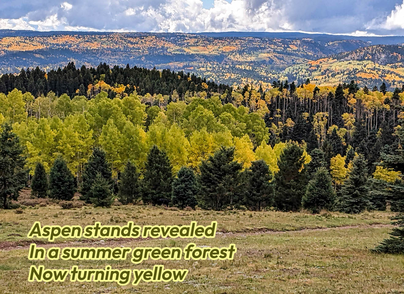 Aspen stands revealedIn a summer green forestNow turning yellow