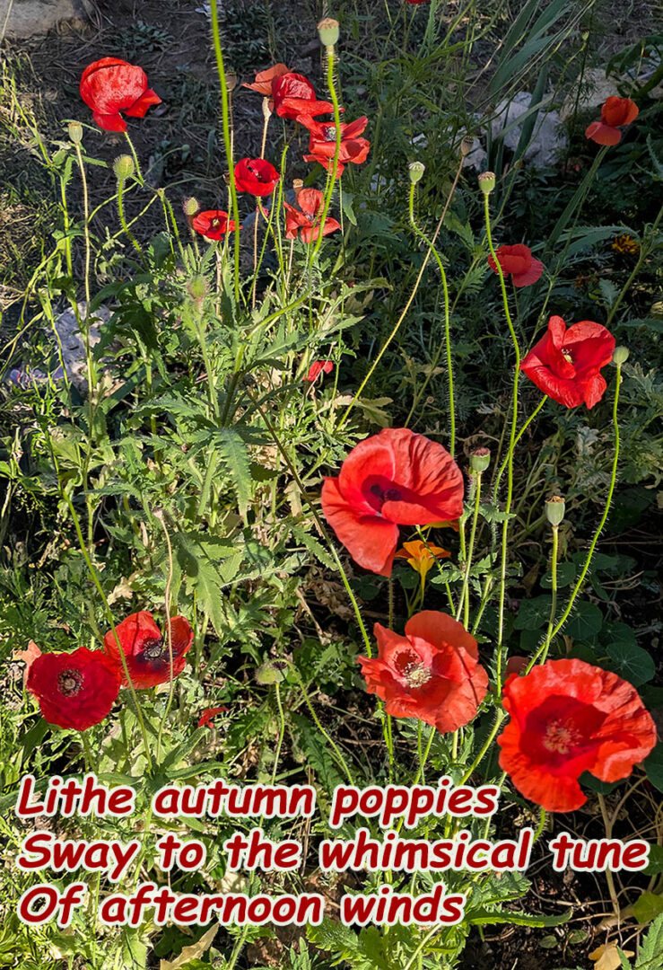 Lithe autumn poppies  Sway to the whimsical tune  Of afternoon winds