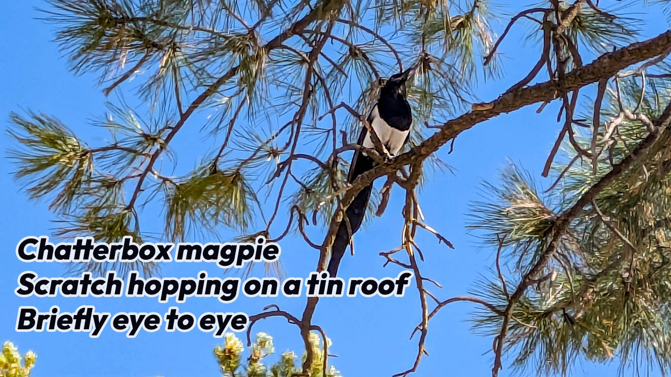 Chatterbox magpie  Scratch hopping on a tin roof  Briefly eye to eye