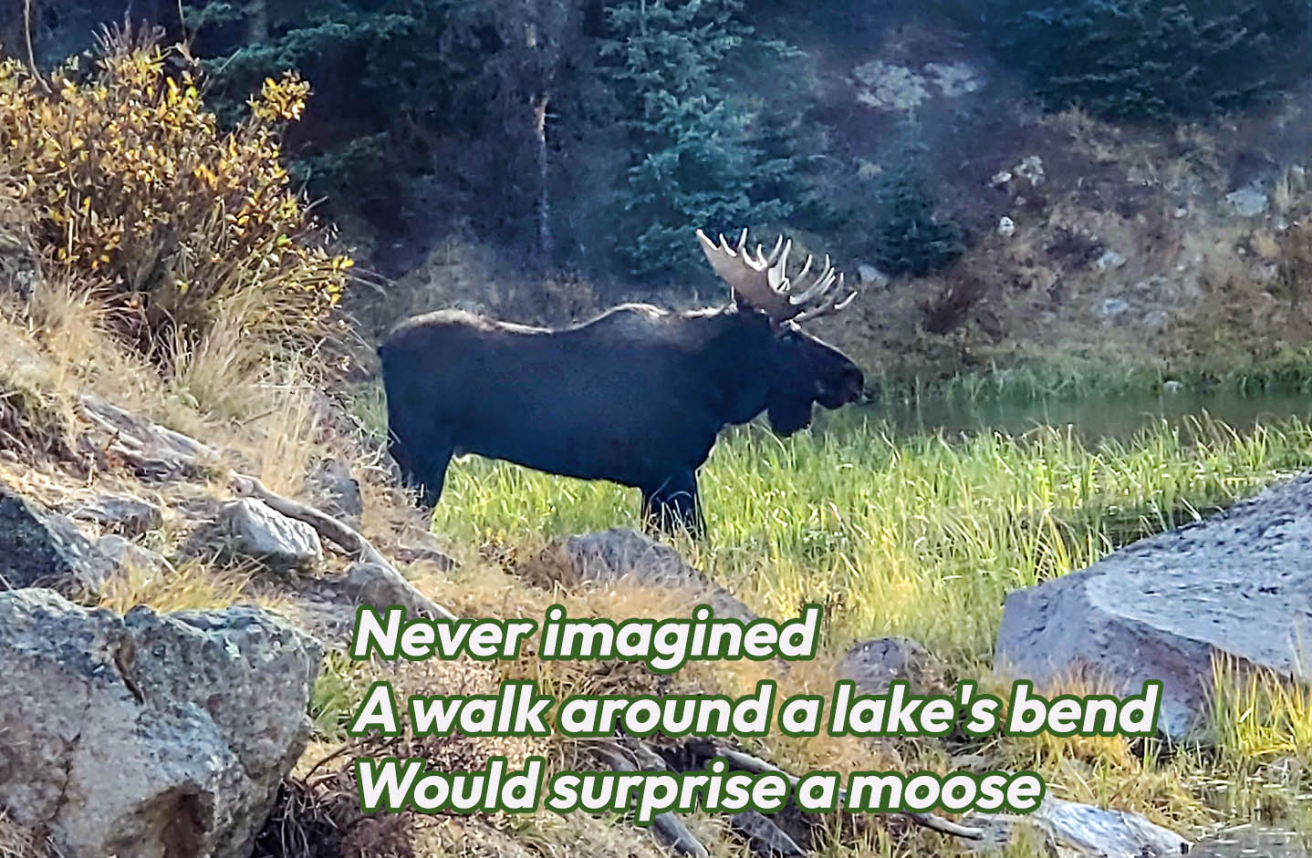 Never imaginedA walk around a lake’s bendWould surprise a moose