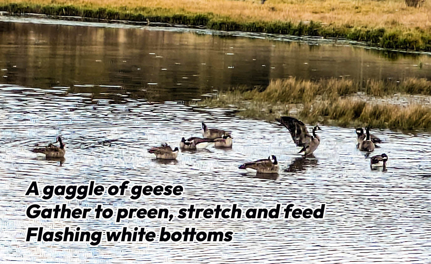 A gaggle of geese Gather to preen, stretch and feed Flashing white bottoms